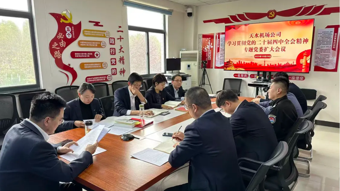 10月29日,天水机场公司召开党委(扩大)会议,专题学习党的二十届四中全会精神。会议传达学习了《中国共产党第二十届中央委员会第四次全体会议公报》,关于《中共中央关于制定国民经济和社会发展第十五个五年规划的建议》的说明,以及省民航机场集团第6次党委扩大会议精神,研究部署公司贯彻落实工作。公司党委班子成员、各党支部书记、各部门负责人参加会议。