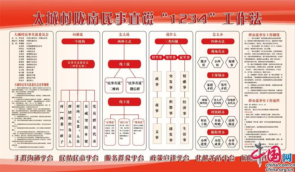 今年以来,甘肃康县认真贯彻落实上级部门关于党建引领乡村治理有关要求,以“创新共同管理机制、探索共同提高路径、构建共同发展格局”为主要内容的“三个共同”促振兴机制创新为抓手,全面推行以“发挥党建引领作用,明确‘向谁说’;运用两种诉说方式,明确‘怎么说’;瞄准三类突出问题,明确‘说什么’;采取四种解决办法,明确‘怎么办’”为主要内容的陇南民事直说“1234”工作法,坚持在“说、议、办、督、评”五个环节上下功夫,紧扣“向谁说、怎么说、说什么、谁来办”等问题,积极探索党建引领乡村治理新路径。