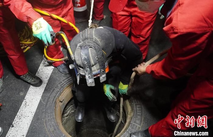 图为“市政蛙人”穿着厚重的潜水服在狭小的污水井里作业。九美旦增 摄