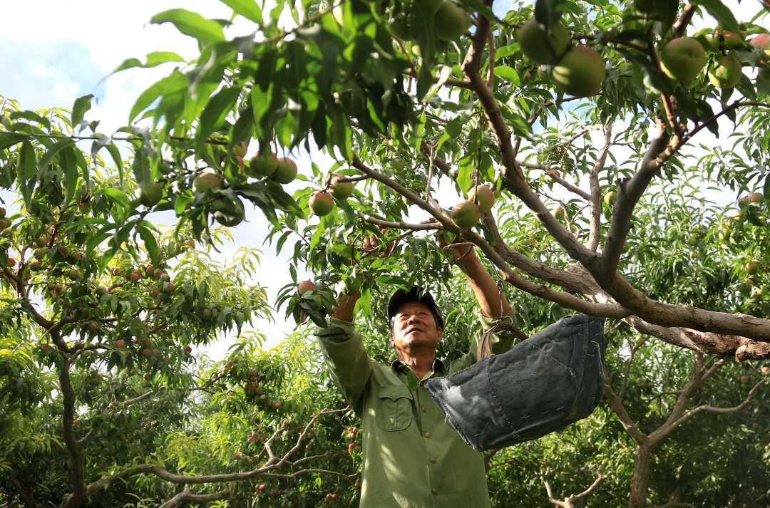 敦煌市七里镇大庙村农民在桃园中采摘紫胭桃。张晓亮摄