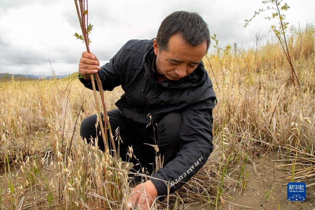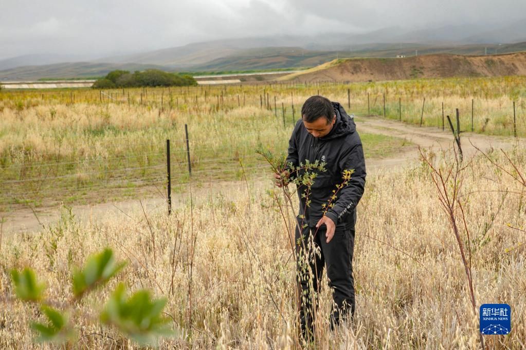 玛曲县自然资源局高级工程师马建云在黄河玛曲段干流沿岸一处阻沙林带建设区域观察植被生长情况(9月16日摄)。新华社记者 郎兵兵 摄