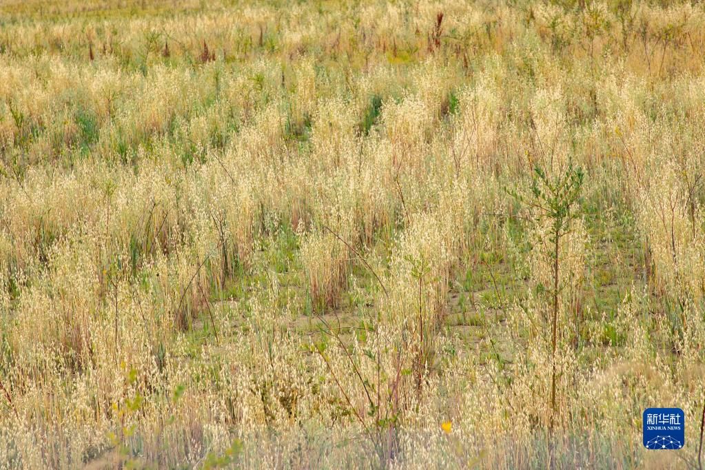 这是黄河玛曲段干流沿岸一处阻沙林带建设区域的草方格沙障内的植被(9月16日摄)。新华社记者 郎兵兵 摄