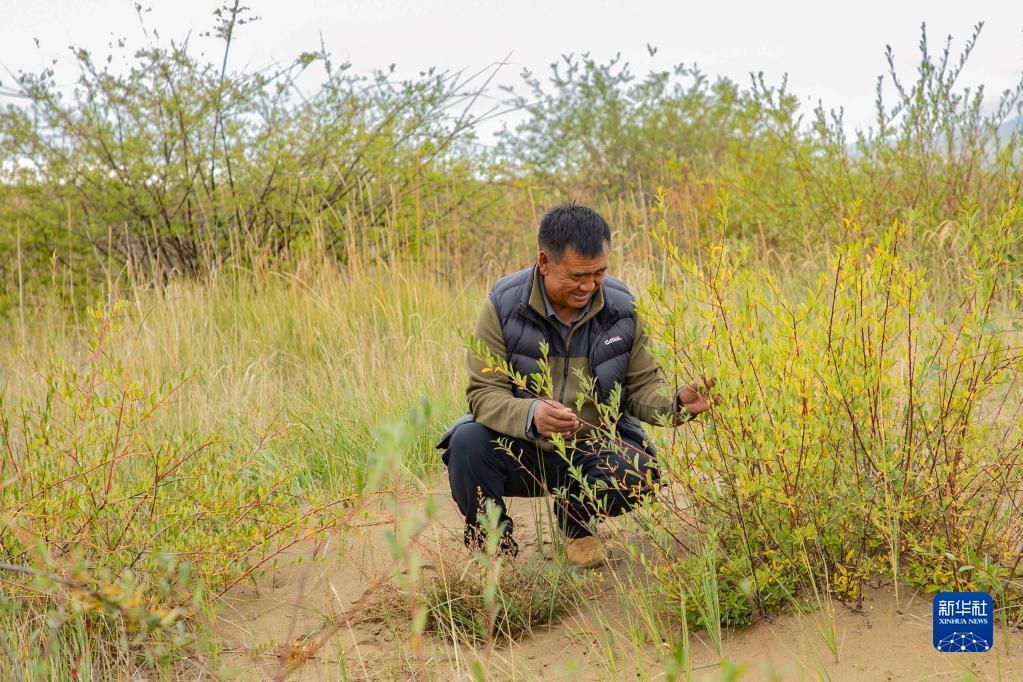 牧民卓玛加布在黄河玛曲段干流沿岸一处沙丘上查看他参与种植的灌木生长情况(9月16日摄)。新华社记者 郎兵兵 摄