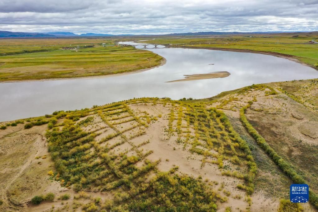 这是黄河玛曲段干流沿岸一处流动沙丘修复治理工程(9月17日摄,无人机照片)。新华社记者 郎兵兵 摄