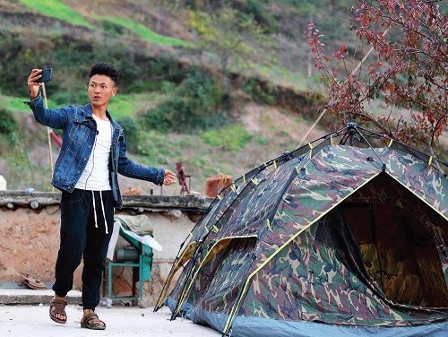 某色拉博用手机拍摄哥哥家租给游客的露营帐篷,准备发到网络直播平台上(2019年11月23日摄) 江宏景摄 / 本刊