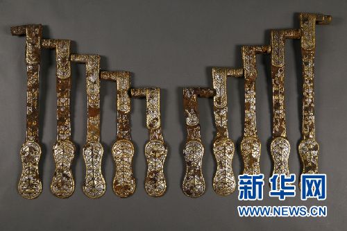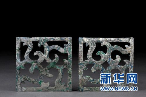 (马家塬遗址出土的贴金银铁车舆后门饰。)