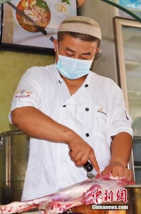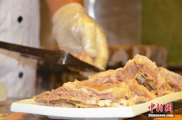 资料图为8月12日,兰州主城区某手抓羊肉招牌老店内,店员正在切新鲜的东乡羔羊肉。 中新社记者 李亚龙 摄