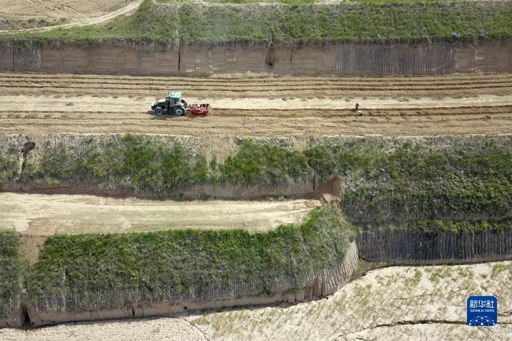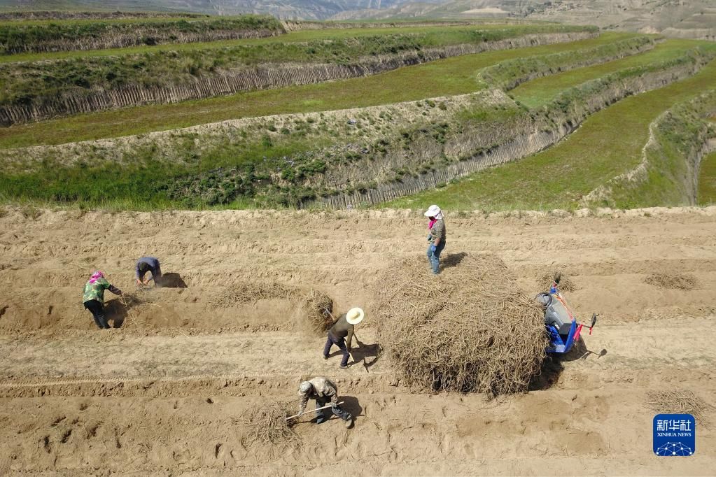 9月21日,农民在位于榆中县贡井镇的榆中宏鑫药材专业合作社种植基地采收甘草(无人机照片)。新华社记者 范培珅 摄