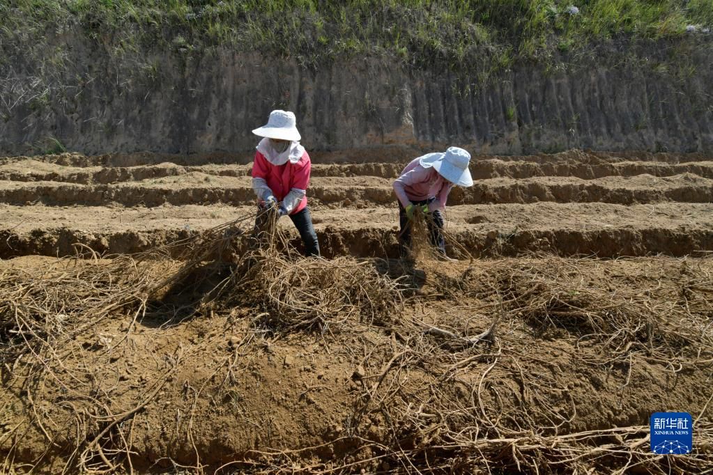 9月21日,农民在位于榆中县贡井镇的榆中宏鑫药材专业合作社种植基地采收甘草。新华社记者 范培珅 摄