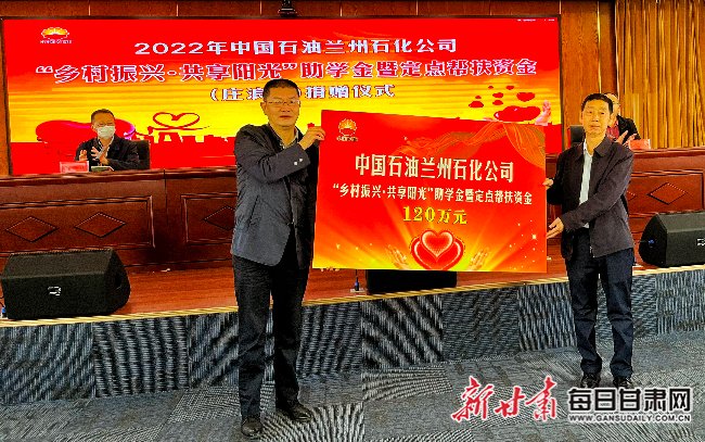 会上,兰州石化公司向庄浪县捐赠“乡村振兴 共享阳光”奖学金120万元,庄浪县委向兰州石化公司赠送“阳光助学温暖庄浪学子 倾心帮扶彰显国企担当”的锦旗。