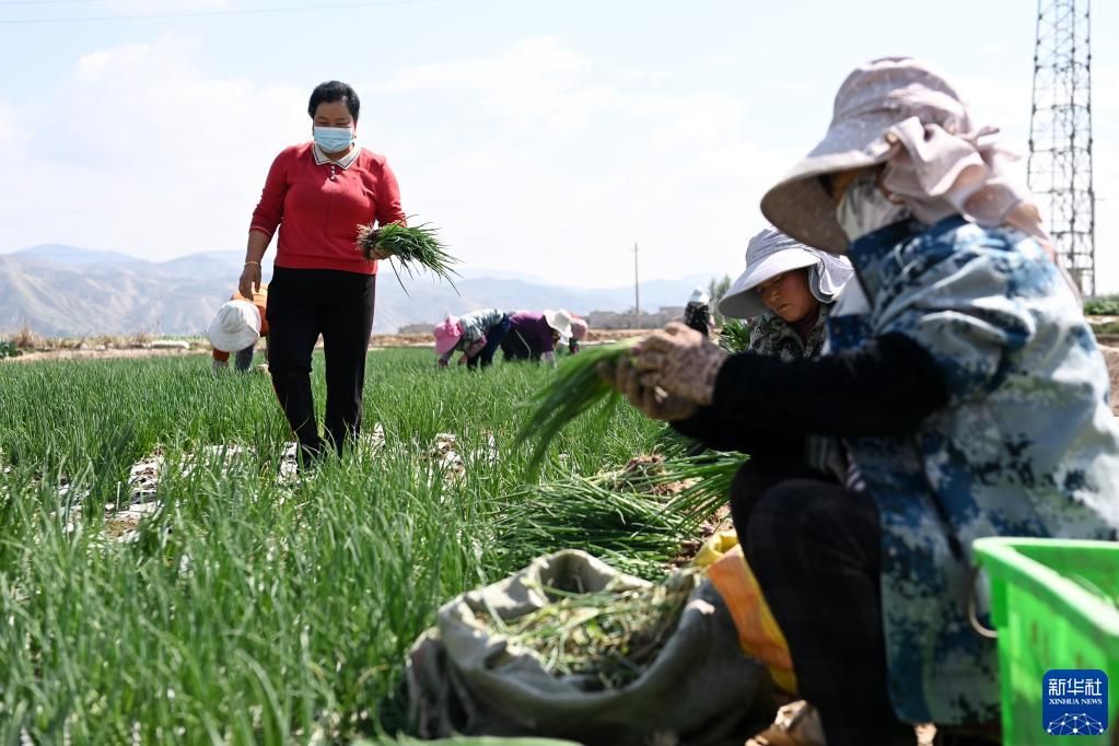 9月21日,在榆中祥龙蔬菜产销专业合作社种植基地,豆俊兰查看小葱长势。新华社记者 范培珅 摄