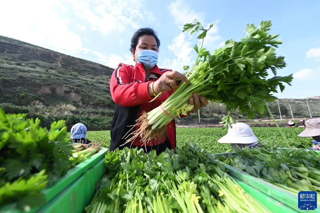 9月20日,在榆中祥龙蔬菜产销专业合作社种植基地,豆俊兰整理采收的芹菜。新华社记者 范培珅 摄