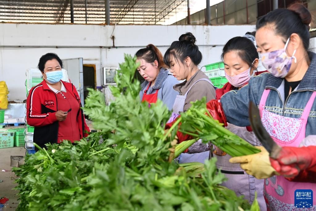 9月20日,在榆中祥龙蔬菜产销专业合作社,豆俊兰(右)在清洗作业线上整理芹菜。新华社记者 范培珅 摄