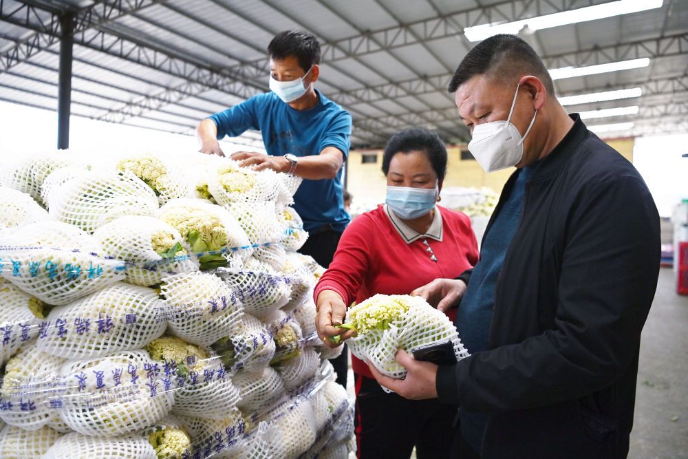 9月20日,在榆中祥龙蔬菜产销专业合作社,豆俊兰(中)和商家查看蔬菜品质。新华社记者 范培珅 摄