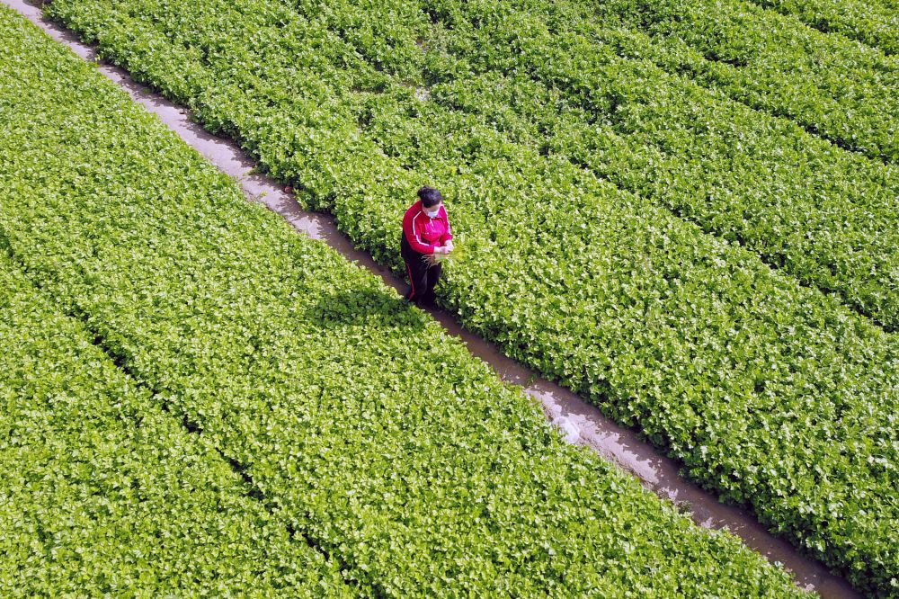 9月20日,在榆中祥龙蔬菜产销专业合作社种植基地,豆俊兰查看芹菜长势(无人机照片)。新华社记者 范培珅 摄