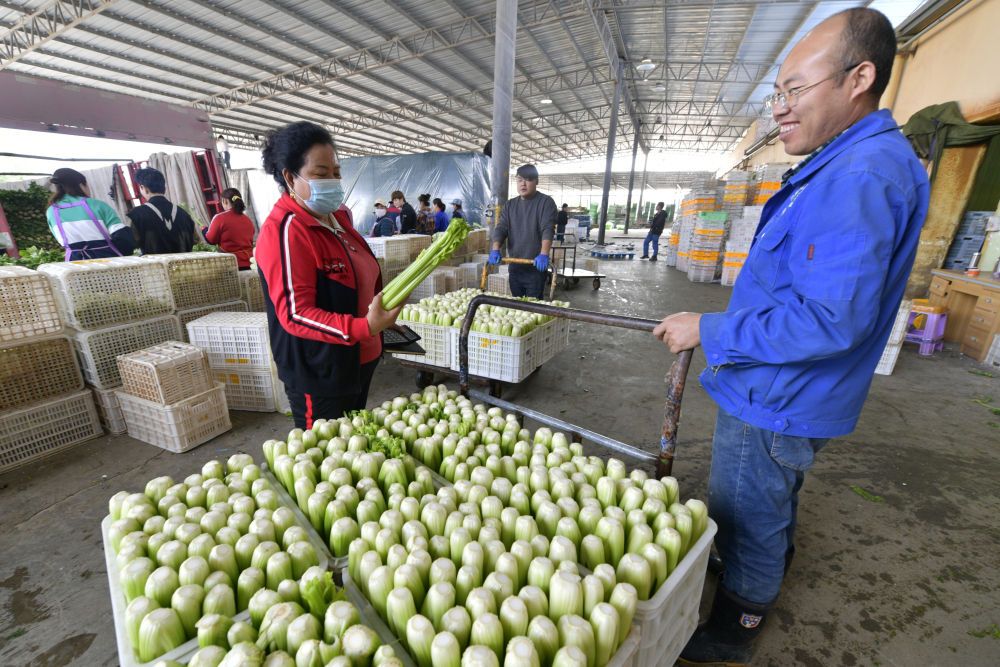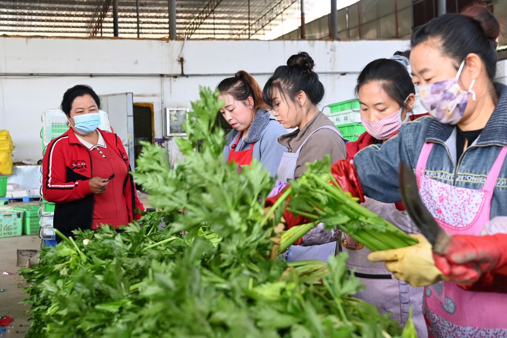 9月21日,在榆中祥龙蔬菜产销专业合作社冷库,豆俊兰(左一)安排芹菜分拣事宜。新华社记者 范培珅 摄