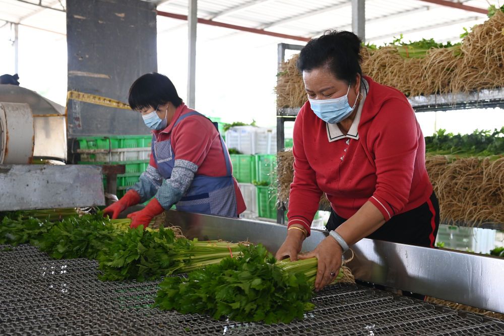 9月20日,在榆中祥龙蔬菜产销专业合作社,豆俊兰(右)在清洗作业线上整理芹菜。新华社记者 范培珅 摄