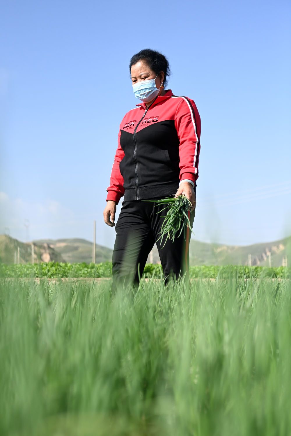 9月21日,在榆中祥龙蔬菜产销专业合作社种植基地,豆俊兰查看小葱长势。新华社记者 范培珅 摄