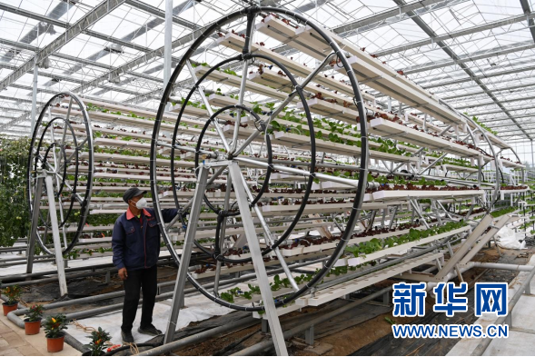 9月23日,在榆中县康源现代设施农业示范园区,工作人员查看旋转式蔬菜种植架上的蔬菜长势。新华社记者范培珅 摄