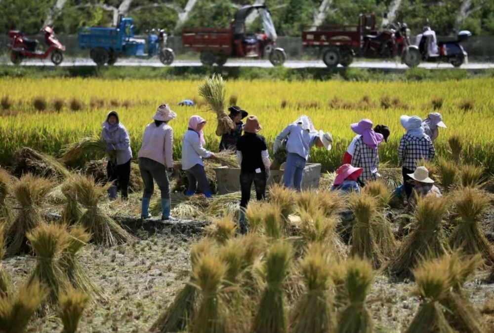 陇南市武都区角弓镇的农户们在稻田里收获。(陇南市委宣传部供图)