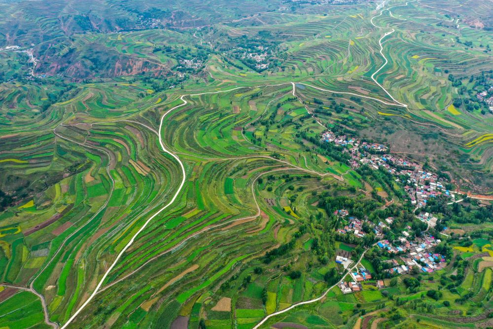 从空中俯瞰,陇南市宕昌县拉路梁万亩中药材绿色标准化种植基地,当归、党参、黄芪、大黄等中药材的叶子苍翠欲滴,犹如一张巨大的绿毯,盖在层层梯田之上。