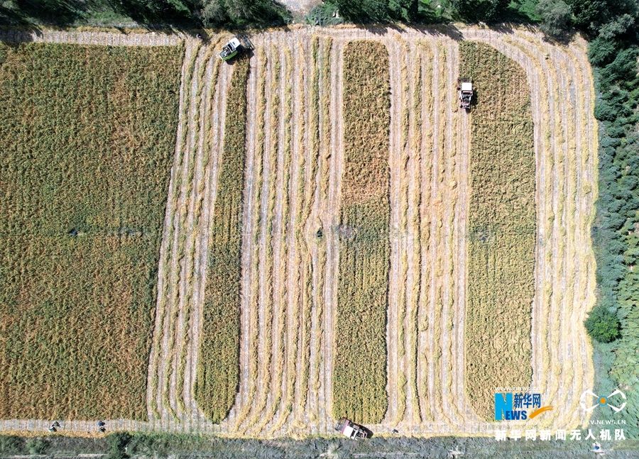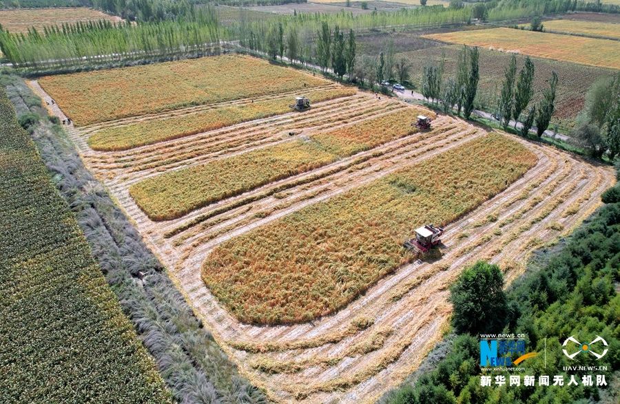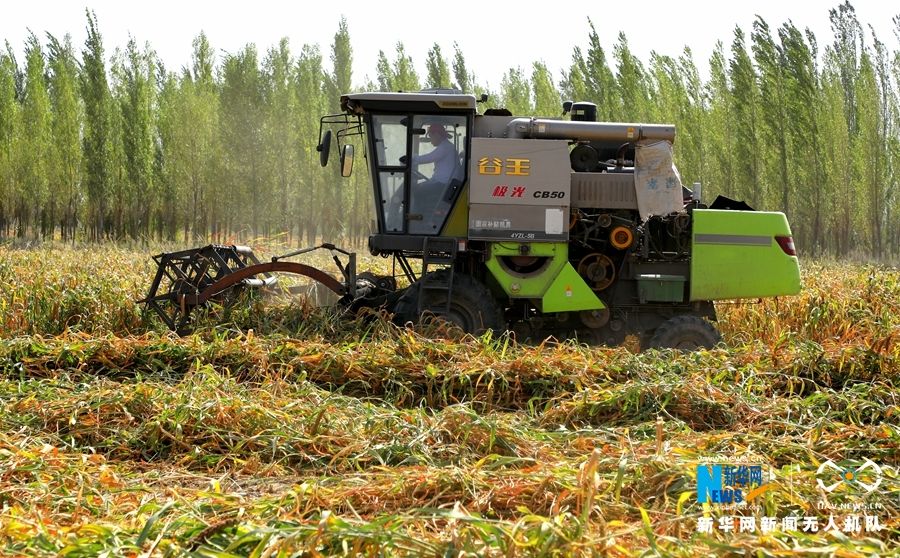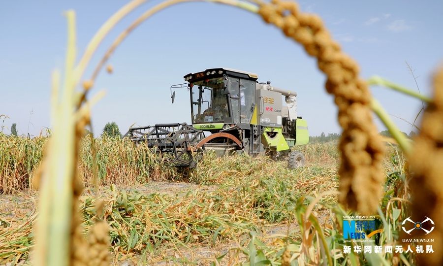 金秋时节,甘肃省张掖市民乐县,成片的谷子进入了成熟期,多台联合收割机来回穿梭,金黄色的谷粒从收割机的传送筒中倾泻而下,一派丰收的喜人景象。