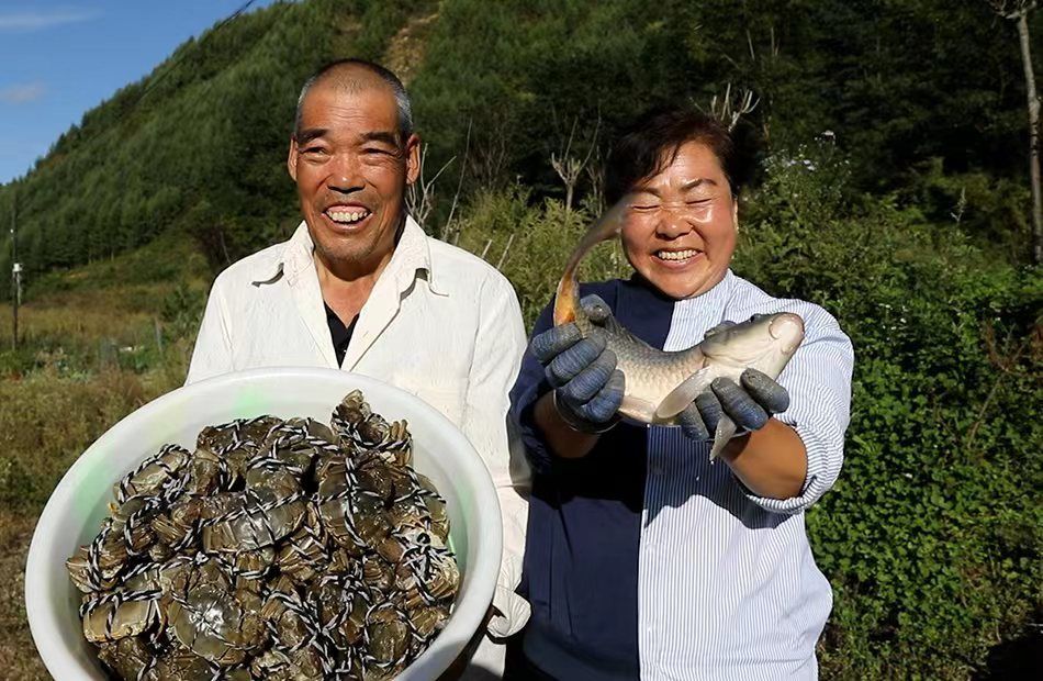 在青山的掩映下,娘娘坝镇小南峪村炬晟蟹养殖农民专业合作社的池塘如一面面偌大的明镜,错落铺开,养殖基地的工作人员正在打捞螃蟹。随着蟹网的徐徐拉起,一个个螃蟹被捞出了水面。
