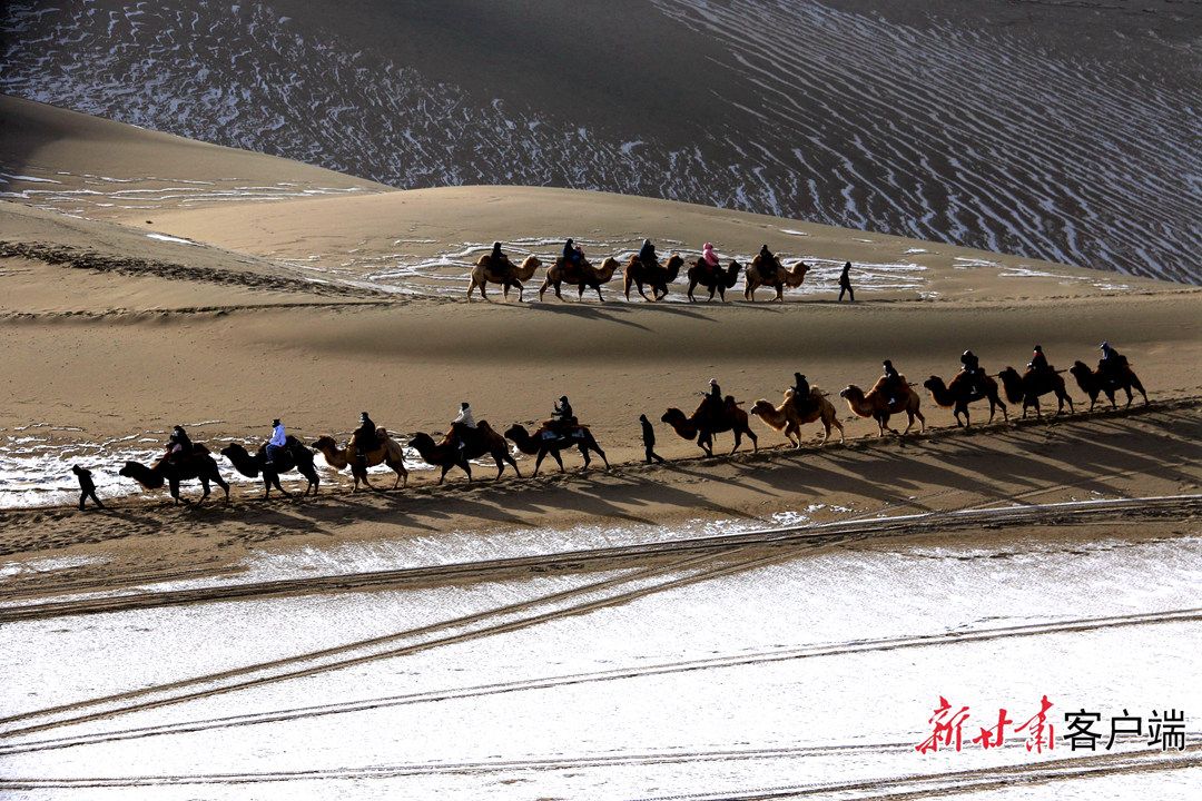 1月23日,游客在敦煌鸣沙山月牙泉景区骑乘骆驼。张晓亮摄