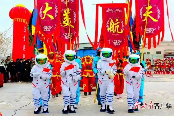 金塔县航天镇群众将“航天服”融入传统社火表演,独具特色。