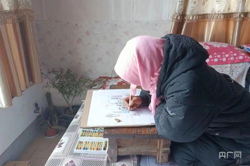 下雨天,没法儿干农活,裴爱民就趴在炕上写字画画。有人进门喊了半天,她沉醉在里面忘了应声。“家里人倒是不怎么反对画画,画画可以给孩子们画手工报啊,可以给庄子上邻居们画绣花门帘或者鞋垫,感觉还有点用。”裴爱民说。