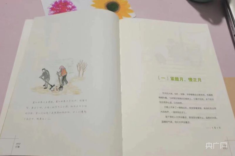 在刚刚过去的2022年,她的第一本书出版了。在书里,她用日记的方式,描写了庄子里的日常生活,搭配着她自己手绘的四十多幅插画。书的封皮像是大地和沙子的灰黄色,右上角一张自拍,是裴爱民的粉色头巾和那张笑意盈盈的脸。