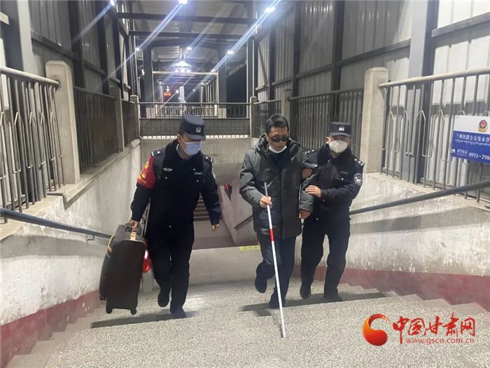 1月28日19时,永登车站派出所民警发现一位没有陪同人员的特殊旅客要进入永登站乘坐火车,民警立即上前帮助他提拿行李,安全送上站台,并向该车次列车长通报了相关情况。