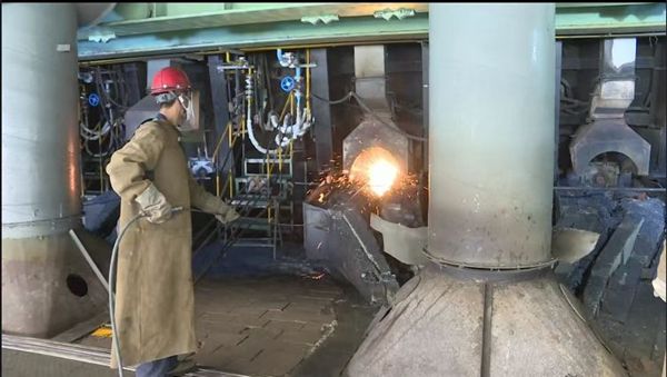 在闪速炉前,阎静鹏手拿吹氧管,身穿特制的防烫服,戴着防烫面屏,双眼一刻不离低镍锍排放口。每隔15分钟,他就要进行一次烧口作业,排放低镍锍15吨左右。操作过程中,排放口不时会飞溅出一串串火红的高温镍花,有些他会侧身躲开,有些会紧擦着他的防护服落到地面。这些“小危险”在他眼中已经成为了工作的常态,他也习惯了在炉前作业时的高温炙烤。