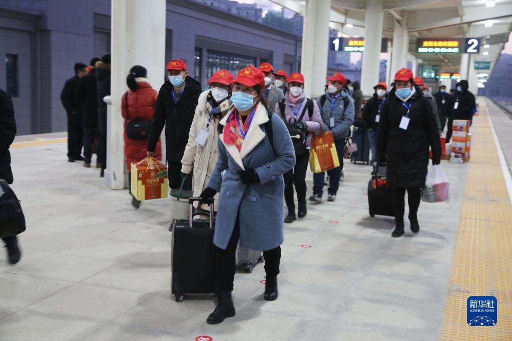 1月30日,务工人员在定西北站站台准备乘车。新华社发(王克贤 摄)