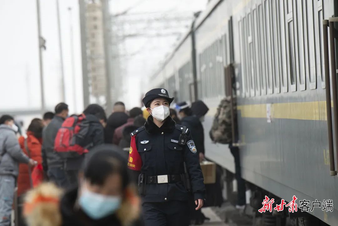 当K368次列车驶进甘肃酒泉站时,当班民警曲丽协助客运部门组织旅客有序上车。这是她当天接送的第10趟列车。