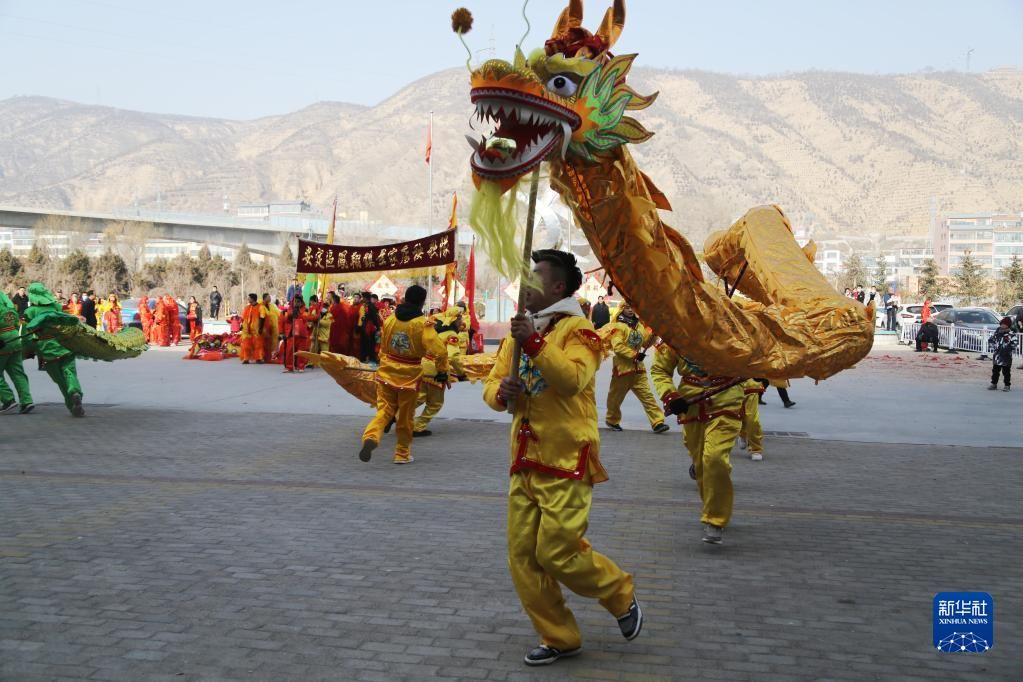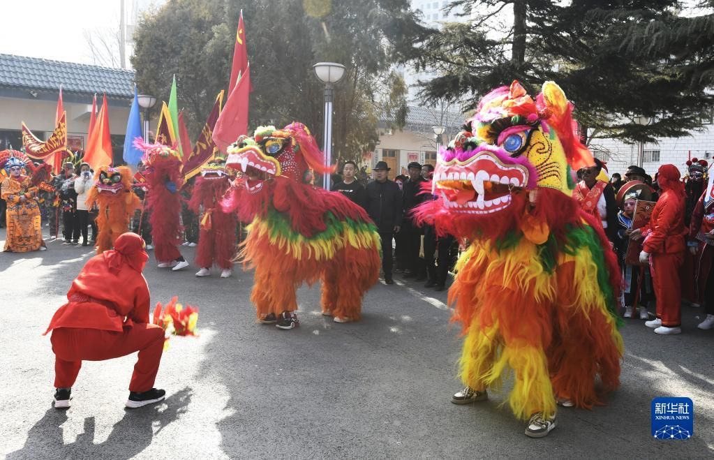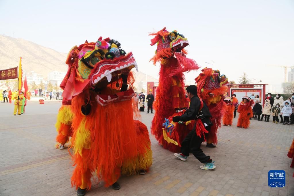 1月30日,在甘肃省永靖县太极镇,村民表演舞狮。新华社发(史有东 摄)