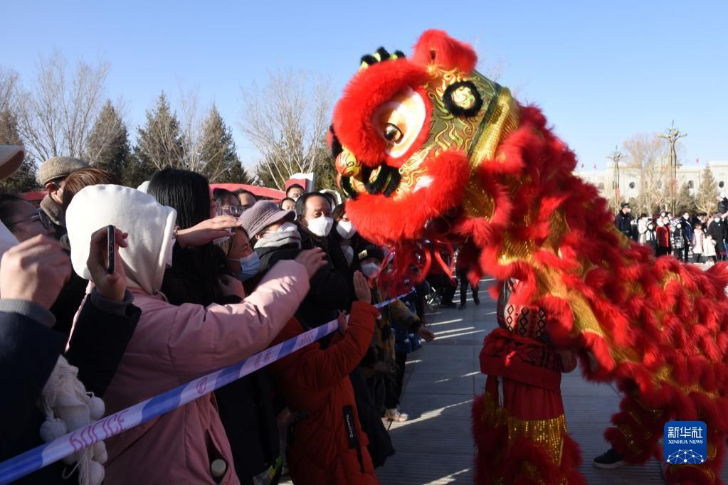 1月30日,在甘肃省阿克塞哈萨克族自治县,社火队员在表演舞狮。新华社发(高宏善摄)