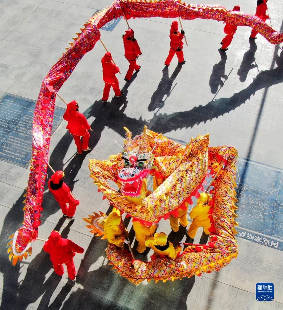 1月30日,甘肃省阿克塞哈萨克族自治县社火队在表演舞龙(无人机照片)。新华社发(马晓伟 摄)