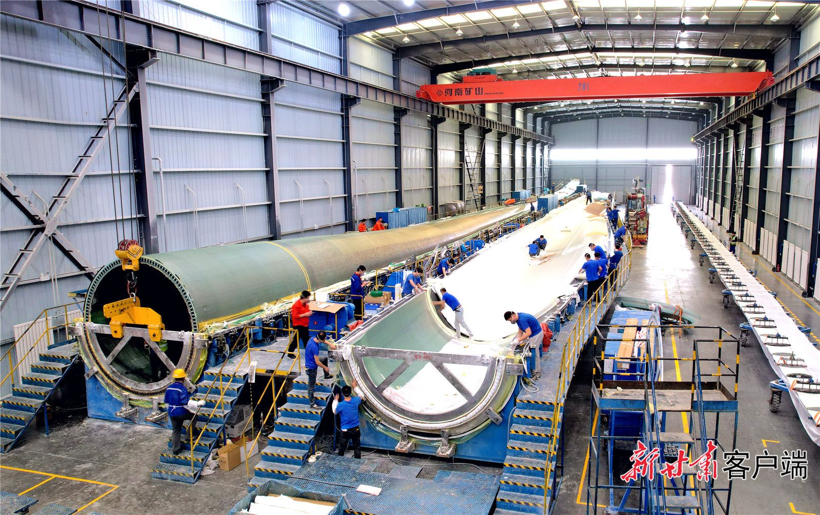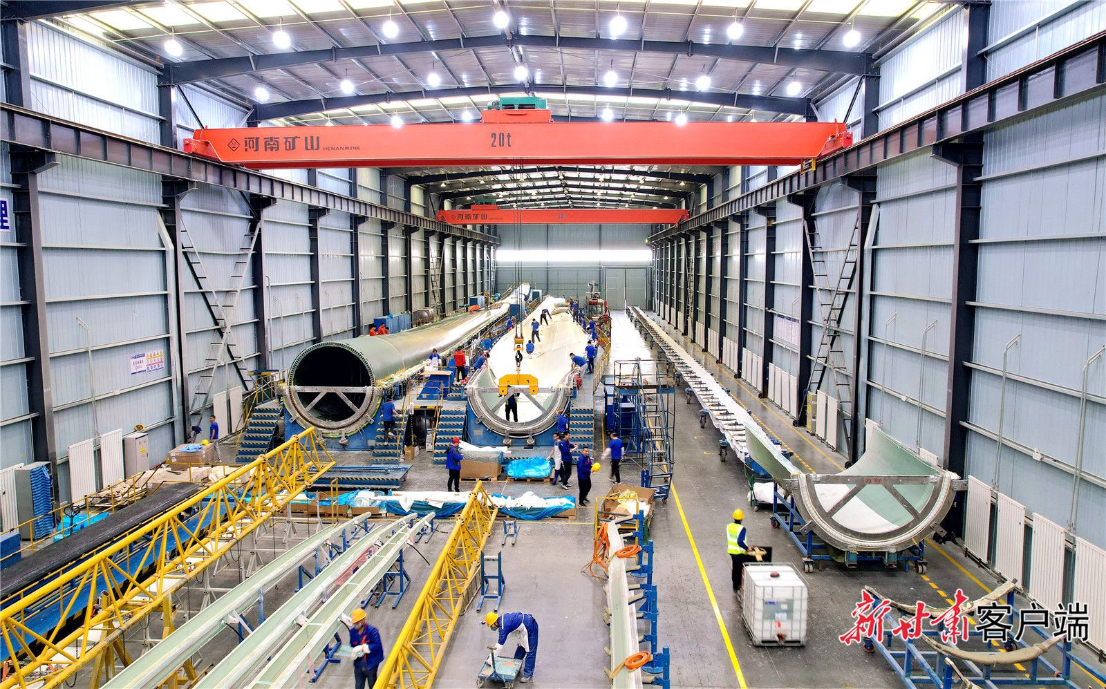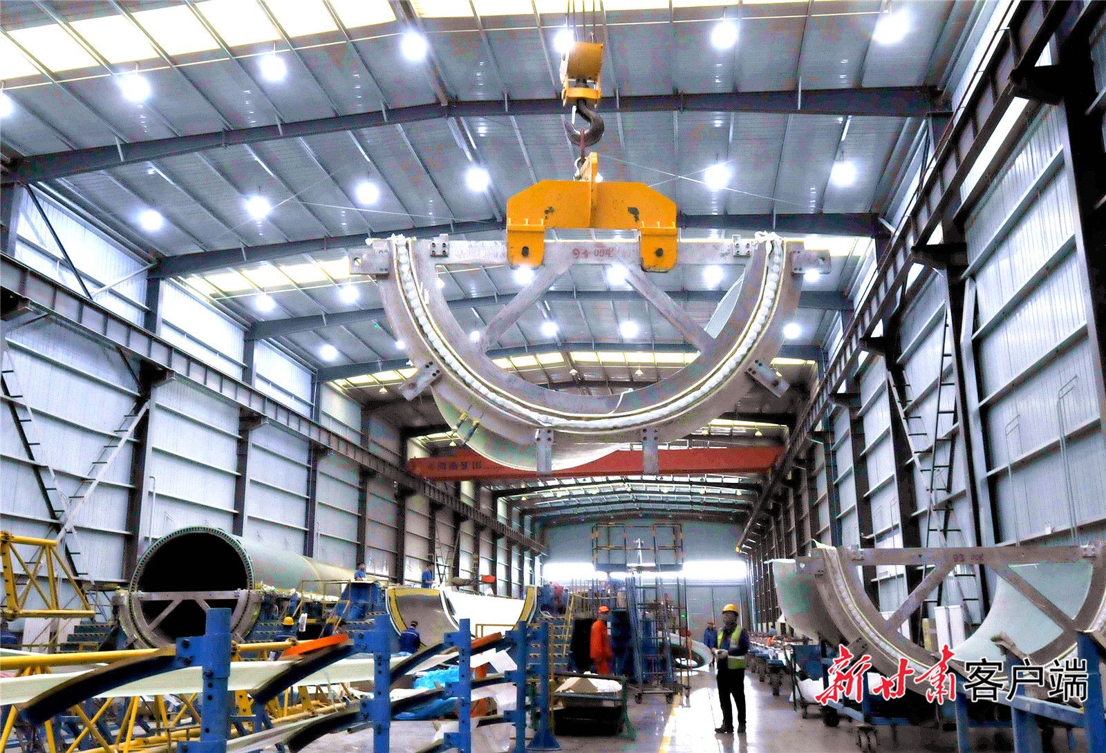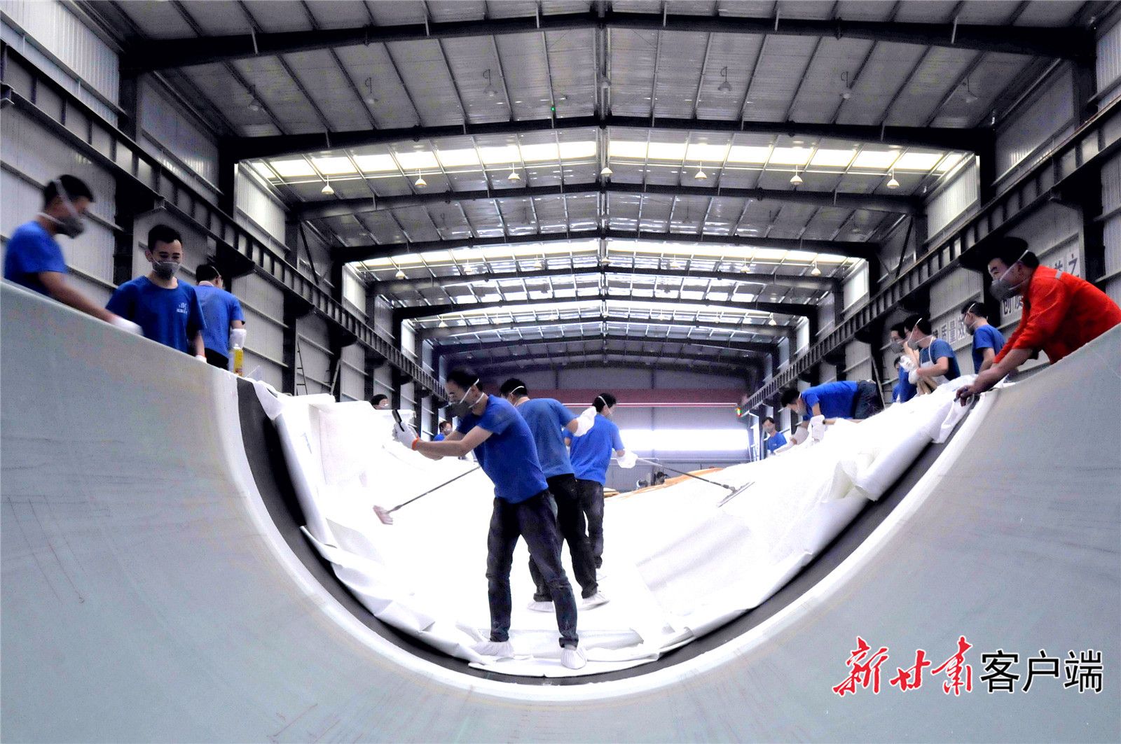 甘肃重通成飞新材料有限公司风机叶片成型车间里,一派“大干快干”的忙碌景象。新甘肃·甘肃日报记者 金奉乾摄