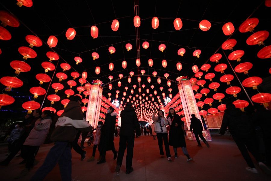 元宵节临近,甘肃省正宁县节日氛围日益浓厚,“璀璨元宵节·红色灯谜展”等活动筹备工作正在加紧进行。在正宁县人民广场,3000余盏大红灯笼及宫灯柱、灯井均已搭建完成,吸引不少群众前来观灯、祈福。 甘肃正宁:华灯璀璨迎元宵 小城年味浓。马会刚摄
