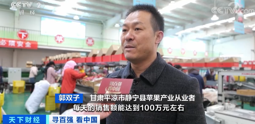 甘肃平凉市静宁县苹果产业从业者 郭双子:特级果平均每斤是10元左右,每天的销售额能达到100万元左右。