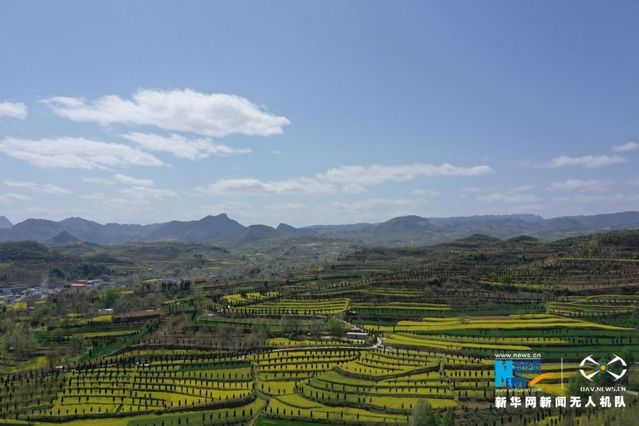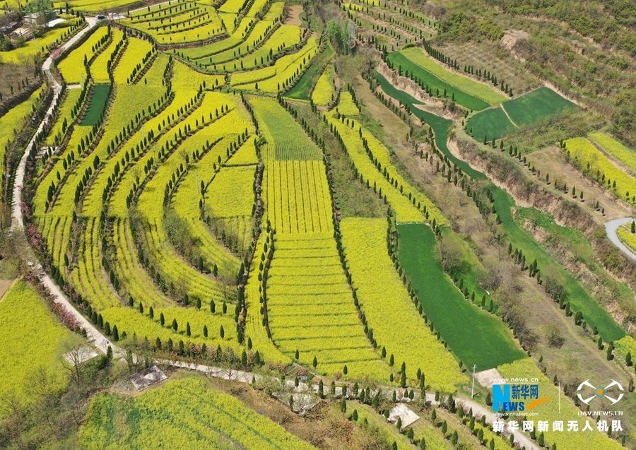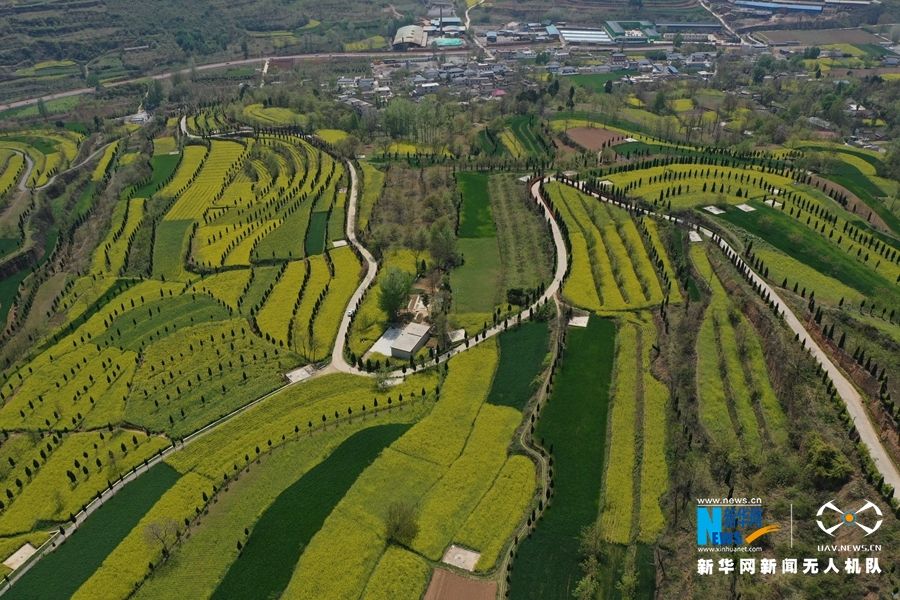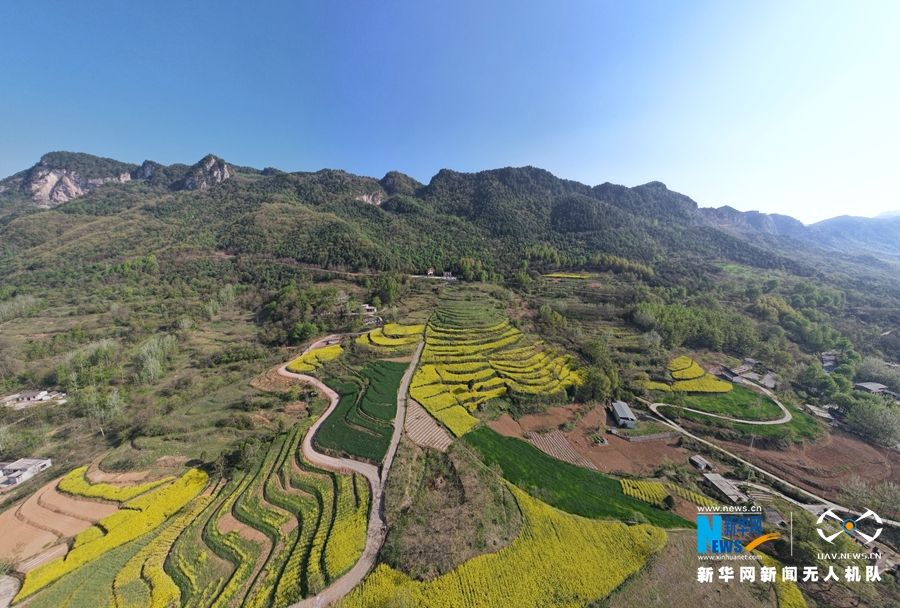时下,甘肃省陇南市成县的乡间田野春意盎然,风景如画。从空中俯瞰,金黄色的油菜花与绿油油的麦田相互交映,勾勒出了一幅醉人的春景图。