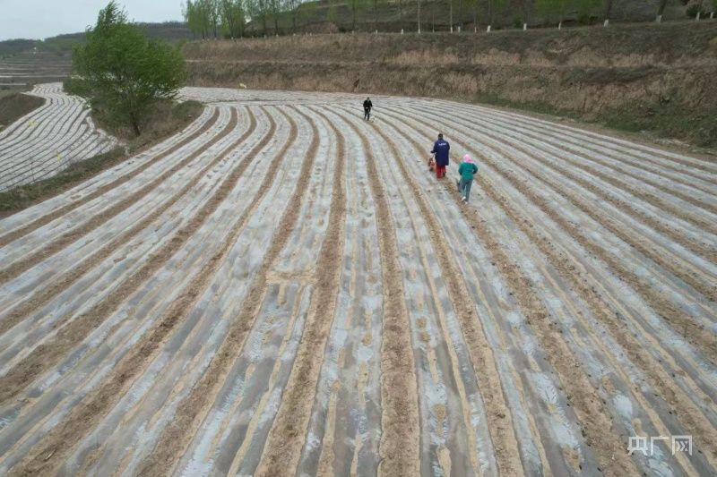 暮春时节,在甘肃省静宁县司桥乡千亩玉米大豆带状复合种植试验基地,一垄垄地膜像一条条银色的丝带,在阳光的照射下泛起道道白光,村民们在田间来回穿梭,按照“四行玉米+三行大豆”的种植模式点播玉米大豆。