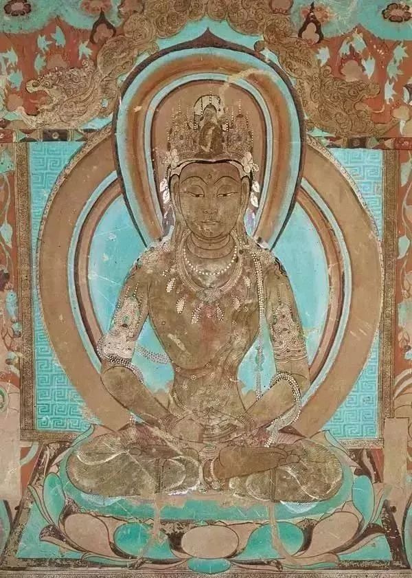 敦煌莫高窟第14窟十一面观音,六臂三目(本面)右三面威怒相,左三面笑怒相,余为寂静相。十一面三重,为三、五、三式,各面俱著一式天冠。璎珞珠宝严饰。上二手合掌下垂,中二手持念珠结印,下左手持净瓶,右手结印,全跏趺坐姿。背倚谷纹宝石背屏,身光多纹样三重,头光辐射状火焰纹。
