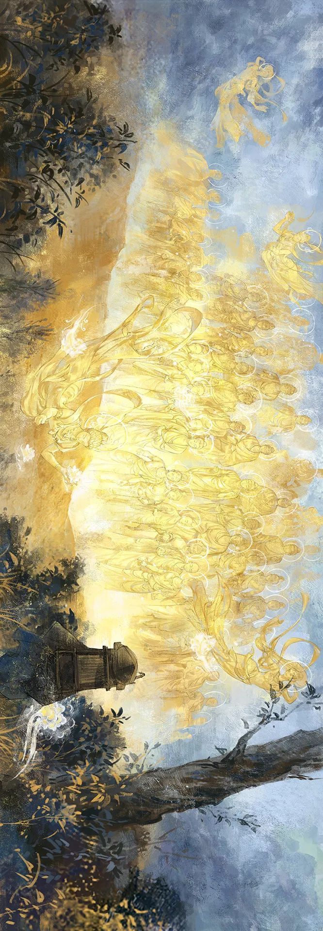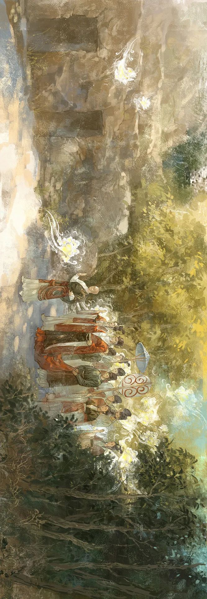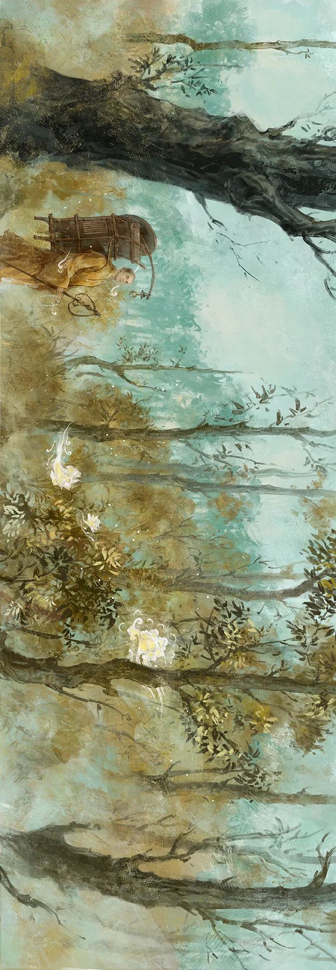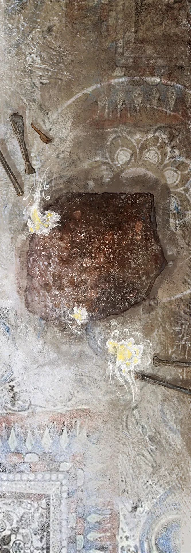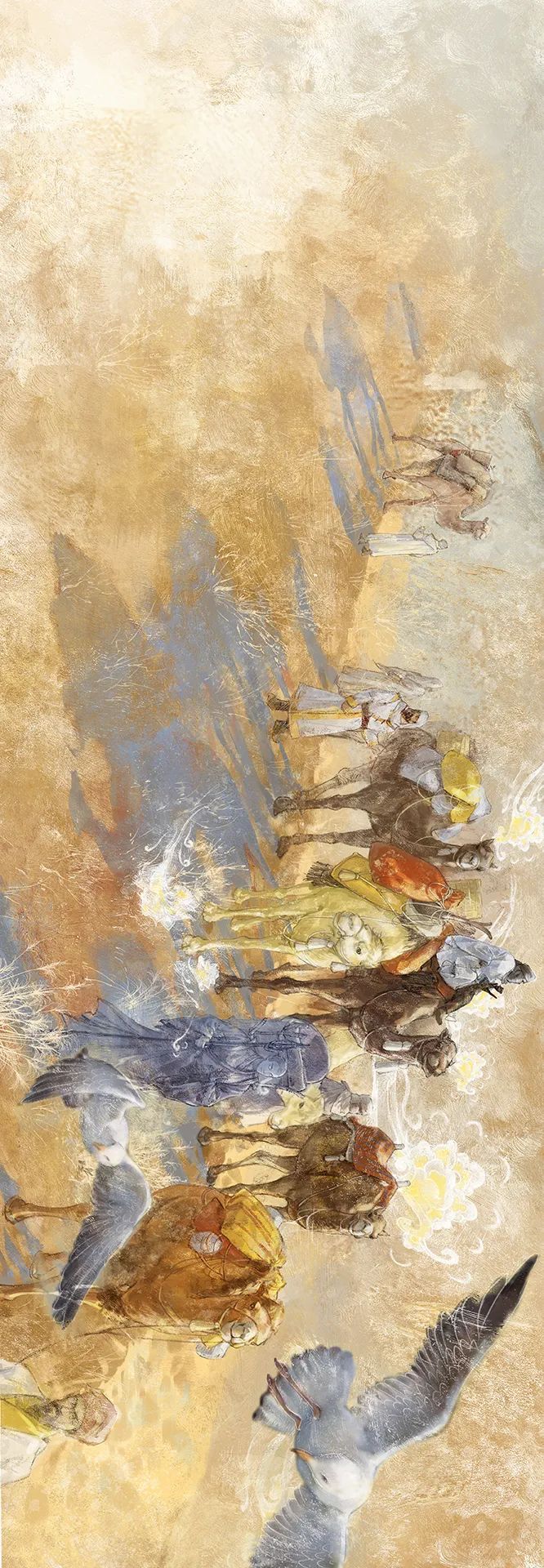 《李君莫高窟佛龛碑》,也称“圣历碑”。碑文中概述了莫高窟营建史并描绘了莫高窟的景色,此碑是敦煌现存最早的一块石碑,也是研究敦煌历史、莫高窟营建的重要资料。以下八张图用数字绘画的形式描绘了《李君莫高窟佛龛碑》中所记载的敦煌莫高窟的诞生过程。构图和色彩都十分具有中国美学韵味,其中的肌理质感更是表现了西域沙漠的苍凉感。
