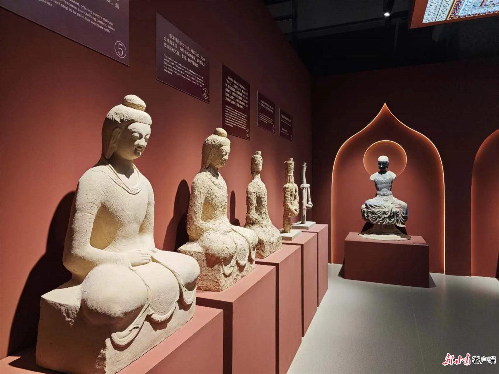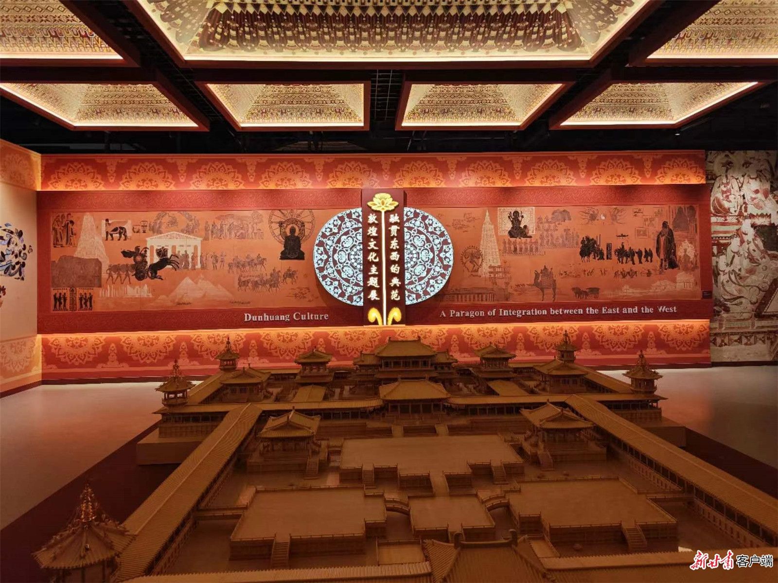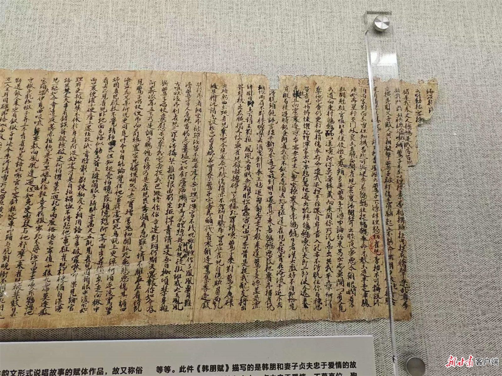 随后,记者来到“融贯东西的典范 敦煌文化主题展”,展馆内充满了敦煌元素。《王梵志诗》《韩朋赋》……一卷卷敦煌遗书的复制品在展馆内铺展开来,密密麻麻的汉字、泛黄的书页似乎穿越了历史的长河,讲述着一幕幕发生在千百年前敦煌波澜壮阔的历史。