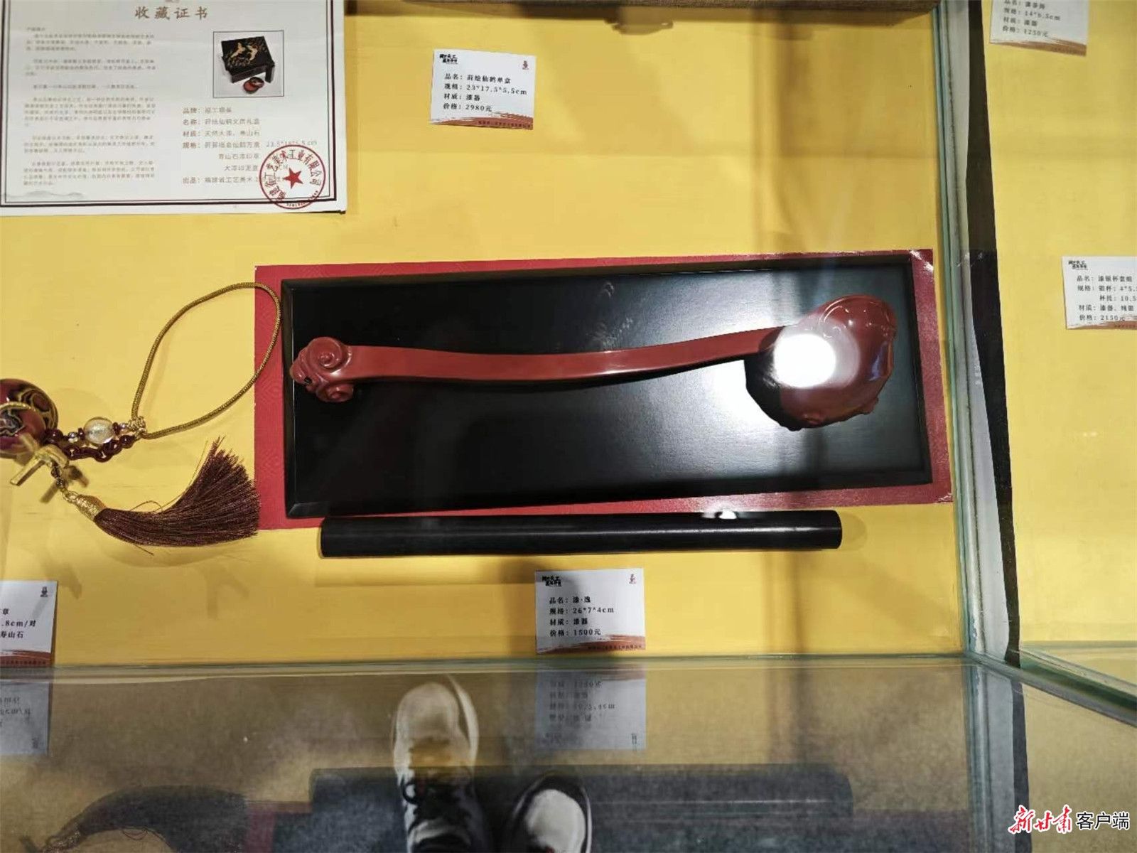 “这是用漆器做成的一柄如意。脱胎漆器是福建的传统工艺,甘肃省又形似一柄如意,这件工艺品放在敦煌具有十分独特的意义。”福建省工艺美术工业有限公司销售部副经理林莺芳介绍说。