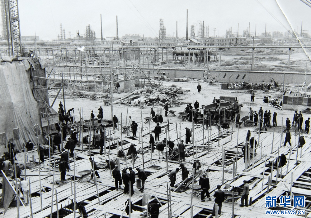 1956年,甘肃省干部群众参加炼油厂、肥料厂、橡胶厂土地平整工程建设。(兰州石化供图)