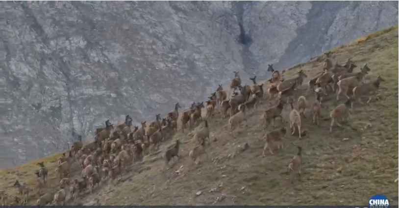 近日,甘肃祁连山自然保护区工作人员在无人机飞巡监测中,跟踪拍摄到100多只国家一级野生保护动物白唇鹿集体活动,大多数为成年鹿,在高山间觅食,这也与其生活习性极为相符。