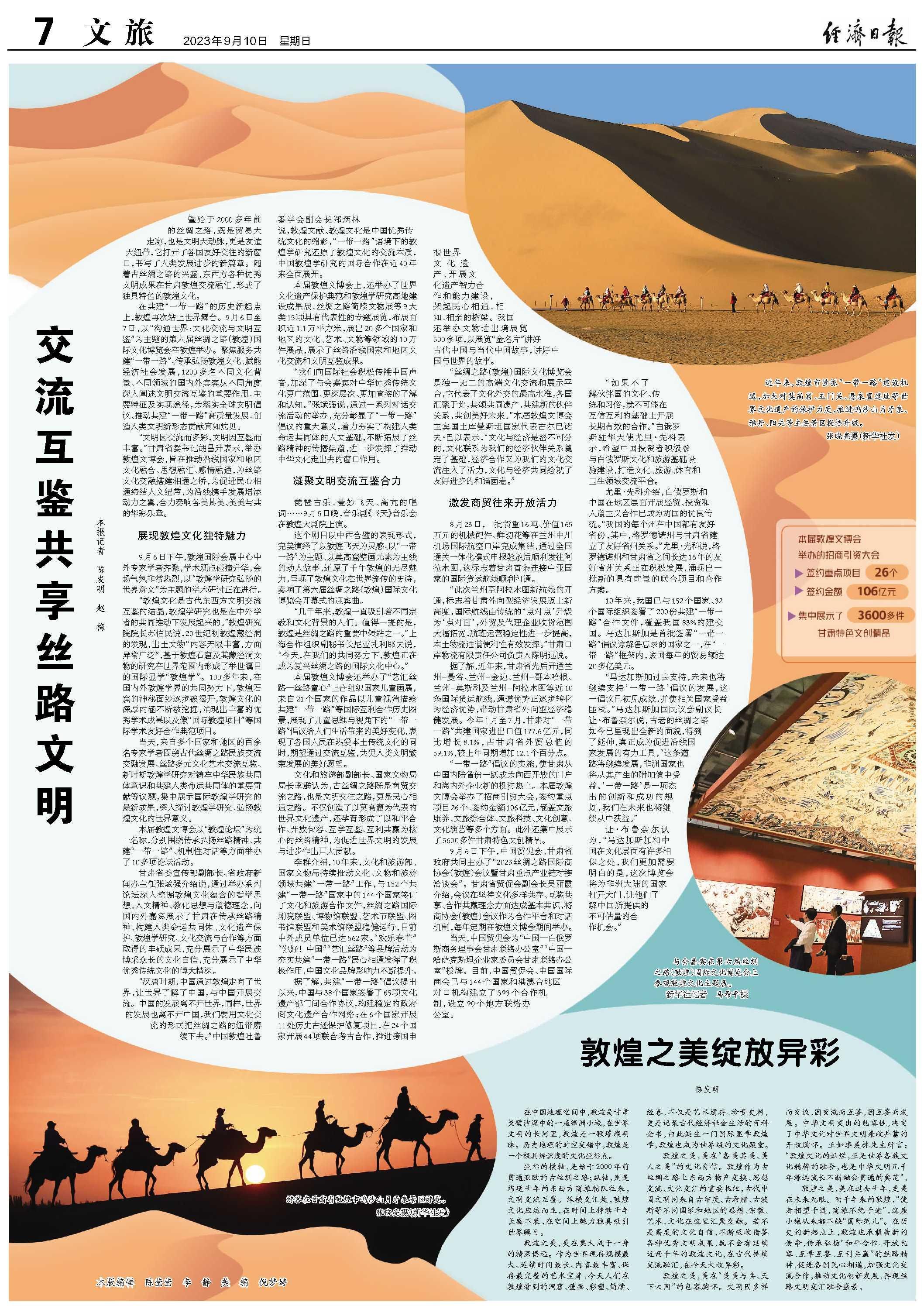敦煌之美,美在过去千年,更美在未来无限。两千年来的敦煌,“使者相望于道,商旅不绝于途”,这座小城从来都不缺“国际范儿”。在历史的新起点上,敦煌也承载着新的使命,传承弘扬“和平合作、开放包容、互学互鉴、互利共赢”的丝路精神,促进各国民心相通,加强文化交流合作,推动文化创新发展,再现丝路文明交汇融合盛景。